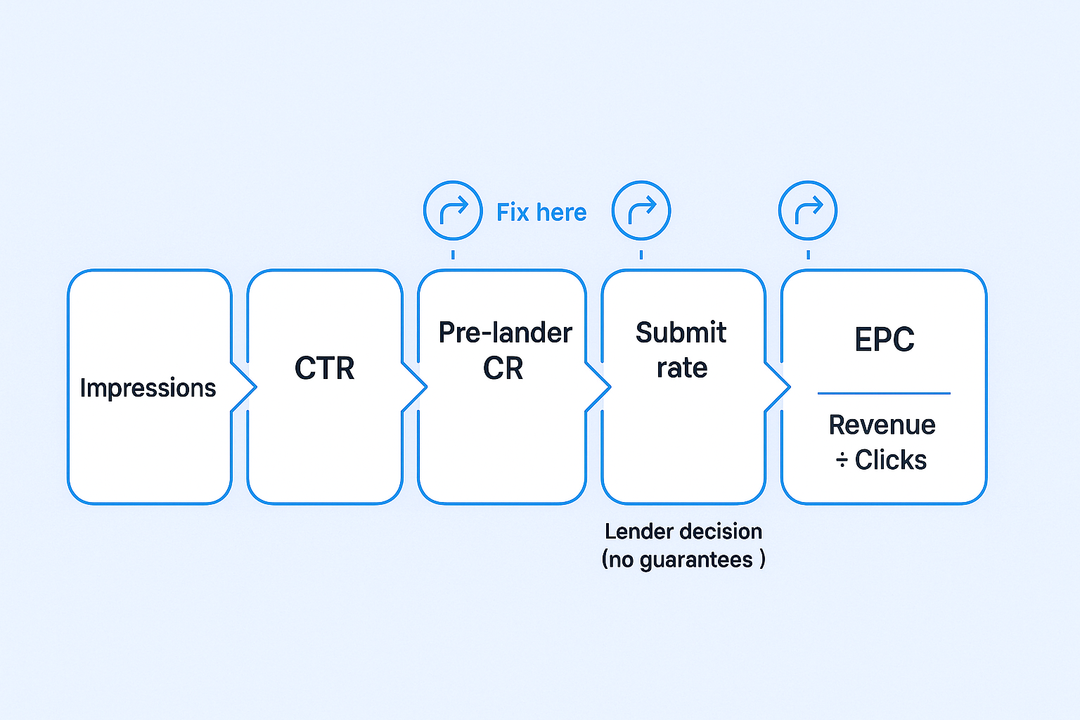 Track the full chain: Impressions → CTR → pre-lander CR → Submit → Approval rate → EPC. The biggest lifts typically come from pre-qualification (eligibility bullets on the pre-lander) and matching offers to your actual channel.