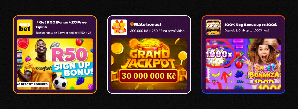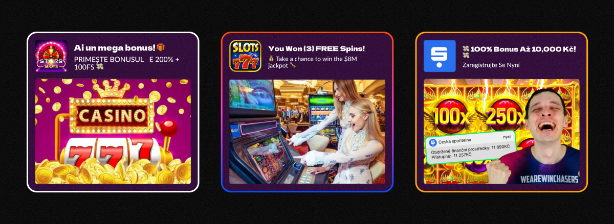 Different approaches: free spins, urgency, emotions, social proof, imitation of a personal message, minimum deposit. It gives you a difference in reactions, plus you can immediately see what's catching on.Targeting settings.