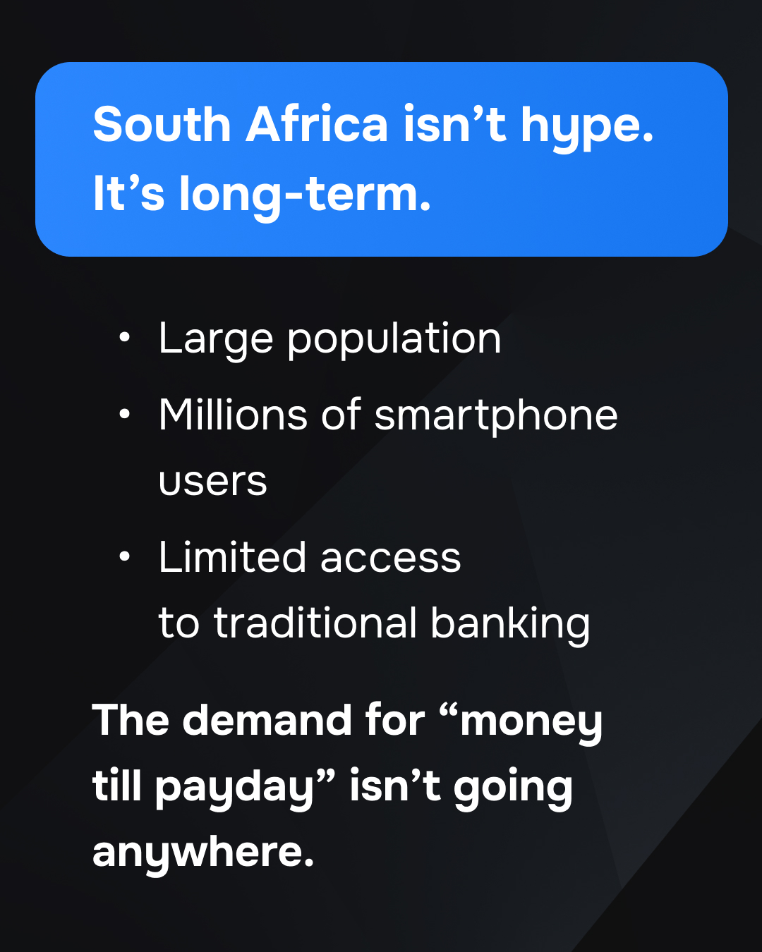 And this isn’t some temporary trend. People will always need to cover gaps before payday. That demand isn’t going anywhere. We see South Africa as a long-term, stable opportunity that’s going to stay relevant for years.