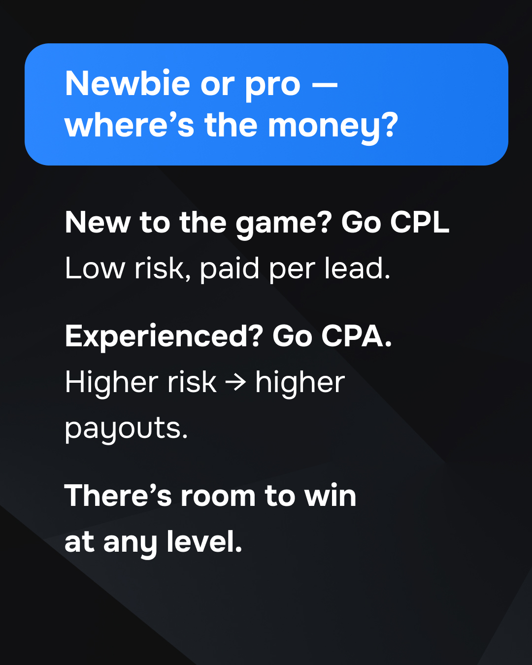 If you’re new — start with CPL. You get paid for every completed application, which keeps risk low. It’s the best way to test the audience and creatives without burning your budget. Finpug or Dengoo are perfect for that.