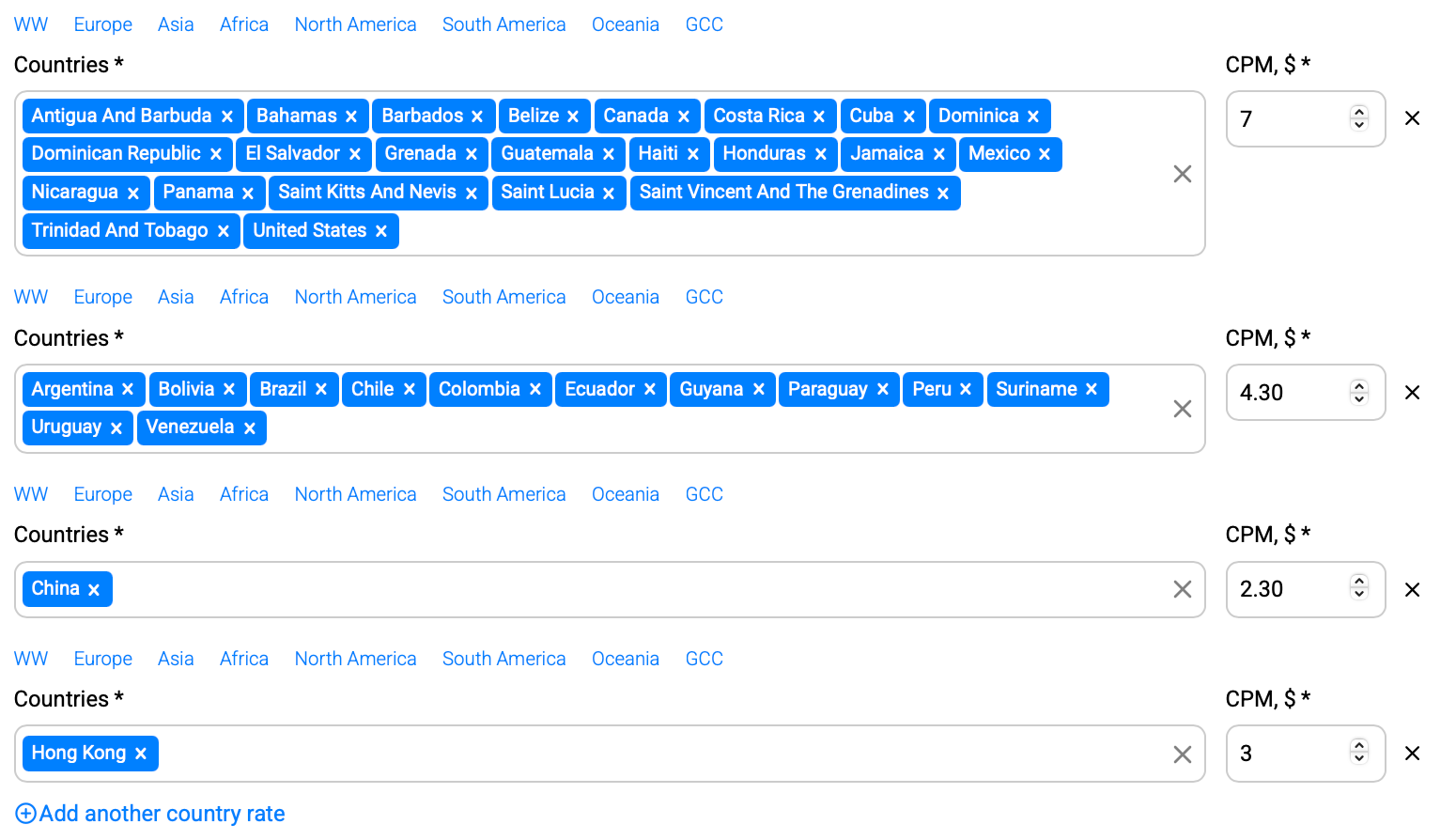 The screenshot below shows examples of setting one CPM for Caribbean countries, another for South America, and separate bids for China or Hong Kong: