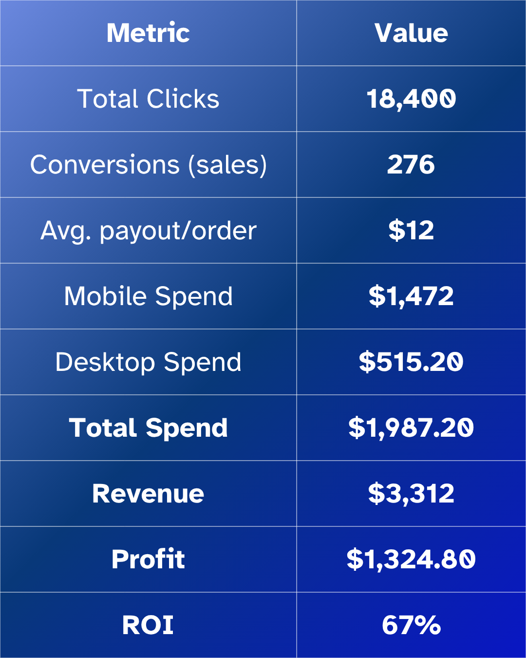 Even with higher CPCs in Tier-1 GEOs, the campaign achieved a 67% ROI, confirming that push traffic is profitable for direct sales.