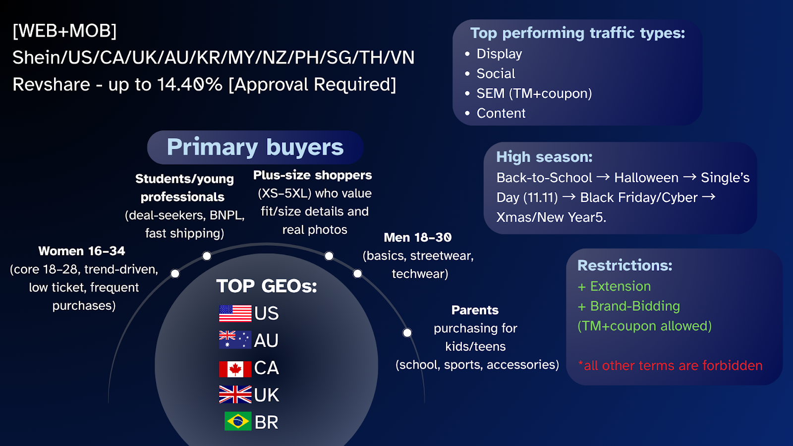 (170333) [WEB+MOB] Shein /US/CA/UK/AU/KR/MY/NZ/PH/SG/TH/VN- Revshare - up to 14.40% [Approval Required]