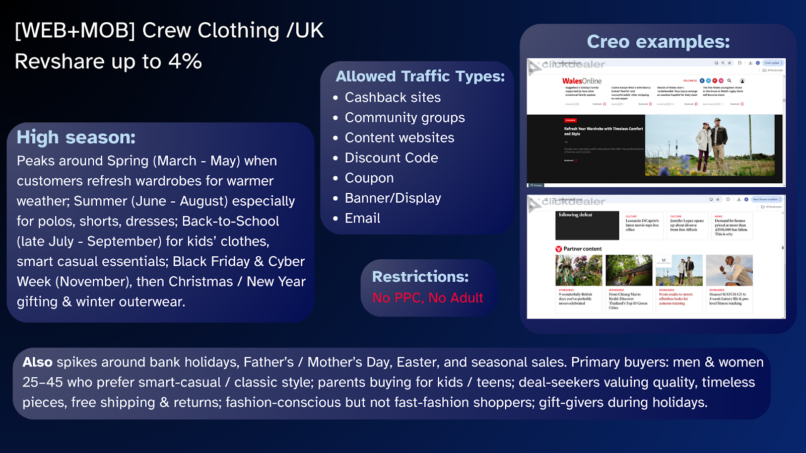 E-commerce is one of ClickDealer's main verticals. Having been active in this space for over a decade, we have a portfolio of exclusive deals with global brands that give affiliates a competitive edge during the Q4 shopping rush. We’ve compiled a selection of offers projected to perform well in Q4 2025, highlighting audience-product category combinations with the highest conversion potential to help you optimize less and profit faster.