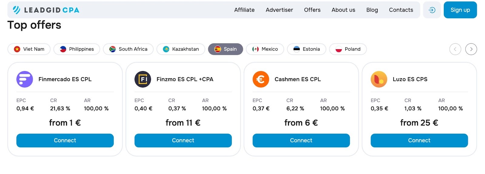 Even though competition can be higher, the size of the market and steady demand for credit products make it a strategically important GEO. Offers like Finzmo ES and IBANCAS ES are good options for affiliates working with higher traffic volumes.
