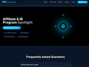 GM Capital FX (gmcfx.com) appears to offer a partner network with typical affiliate/introducing broker (IB) features common in forex broker referral programs. This includes revenue-share and CPA opportunities — for example, up to ~80% revenue share and up to ~50% CPA payouts — along with a real-time dashboard and marketing support for partners.