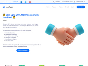 LaraPush is a self-hosted push notification platform that delivers high-performance push notification solutions for publishers, marketers, and affiliates. Our affiliate program allows partners to earn strong commissions by promoting LaraPush plans worldwide. We offer reliable tracking, transparent reporting, timely payouts, and dedicated affiliate support.