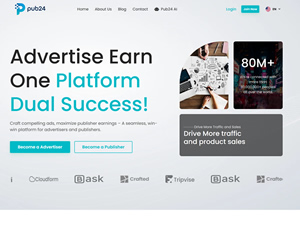 Pub24 Media is a next-generation digital advertising network that connects advertisers and publishers through high-quality PPC and CPM ad formats. The platform offers advanced anti-fraud protection, accurate geo-targeting, and a user-friendly dashboard for real-time tracking of clicks, impressions, and revenue. Publishers can monetize their websites with premium ads, while advertisers benefit from reliable traffic sources and optimized campaign performance. Pub24 Media maintains a solid reputation for reliability, transparency, and professional support, making it a strong choice for both publishers and advertisers looking for stable growth.