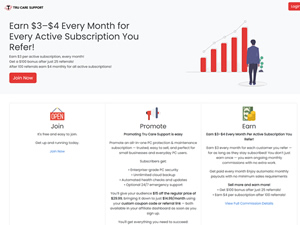 Join the Tru Care Support Affiliate Program and earn lifetime recurring commissions! Promote our monthly PC Security & Health subscription service, which includes SentinelOne-powered EDR security, unlimited cloud backup, automated health checks, alerts, reports, and more. Affiliates earn $4 per subscription monthly, with bonuses of $100 after 100 sales and increased commissions at 500 and 1000 sales. Easy to promote, high-demand product for individuals and small businesses needing PC protection and support.